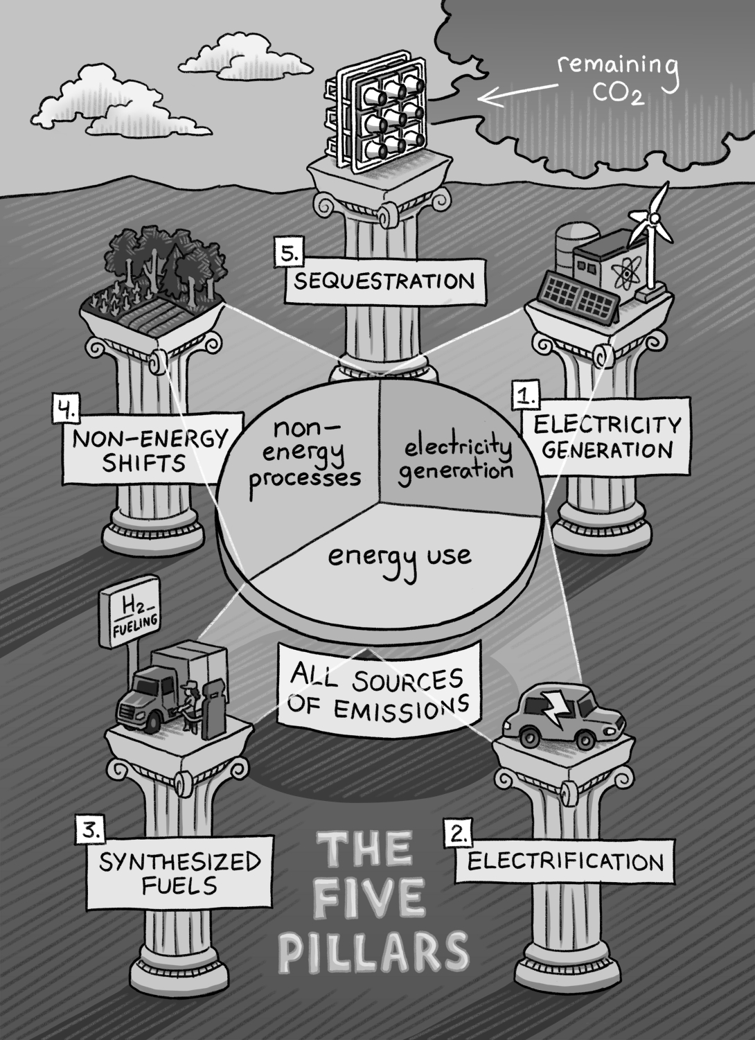 - Sequestration. To close the gap to net-zero emissions and get into net-negative emissions, we must actively remove CO2 from the atmosphere. Growing forests and managing soils can affordably accomplish the first portion of needed sequestration, but direct air capture and possibly other technological methods will be needed to reach the required volume of sequestration each year.