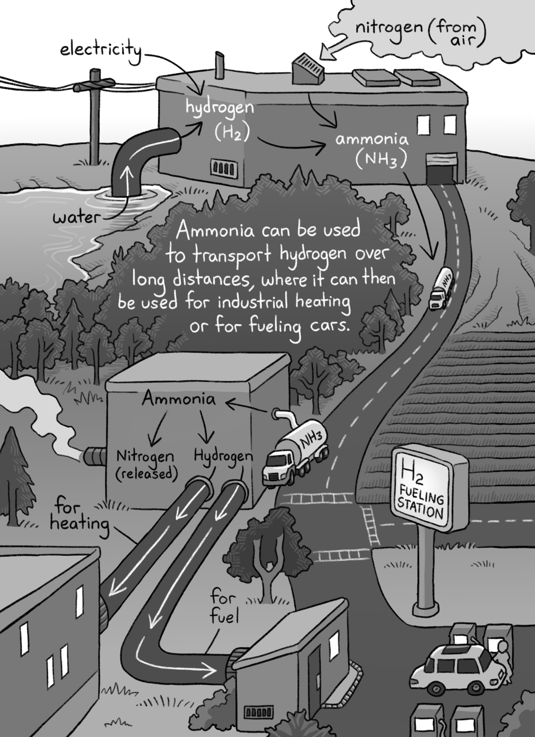 And then, in pillar 3, we note that some processes can’t run on batteries or the grid and must have clean fuels. There’s nothing that says any of them absolutely must use ammonia, but delving into the role of synthesized fuels, it’s pretty clear that ammonia will play a role. For one, either ammonia or hydrogen can be used as the end fuel for road and ocean transportation (and some industrial processes) – and when they can be used, they’re likely to be cheaper per unit of energy than carbon-based fuels (synthetic, carbon-neutral diesel and such) because their synthesis doesn’t require the extra step of filtering CO2 from the air and disassociating the carbon and oxygen. And even if hydrogen is the end fuel, it will often make most sense to transport it as ammonia across large distances.