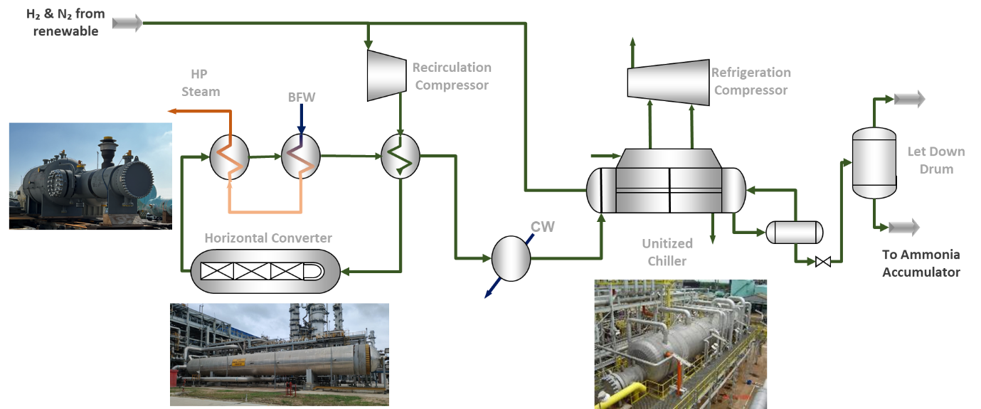 K-GreeN® technology consists of a fully integrated solution for the electrolysis of water to produce hydrogen, the separation of air to produce nitrogen and the Haber-Bosch synthesis of renewable ammonia, plus critical storage capacities (hydrogen and power when required). The KBR ammonia synthesis section is a proprietary design with demonstrated reliability and lower energy consumption at lower capital cost (due to lower equipment count). Depending on plant capacity, the synthesis section uses a vertical or horizontal ammonia converter. KBR has designed both types of converters for many plants currently in operation. The other distinctive feature of KBR’s ammonia technology is the unitized chiller, which reduces capex significantly and provides ease of operation.