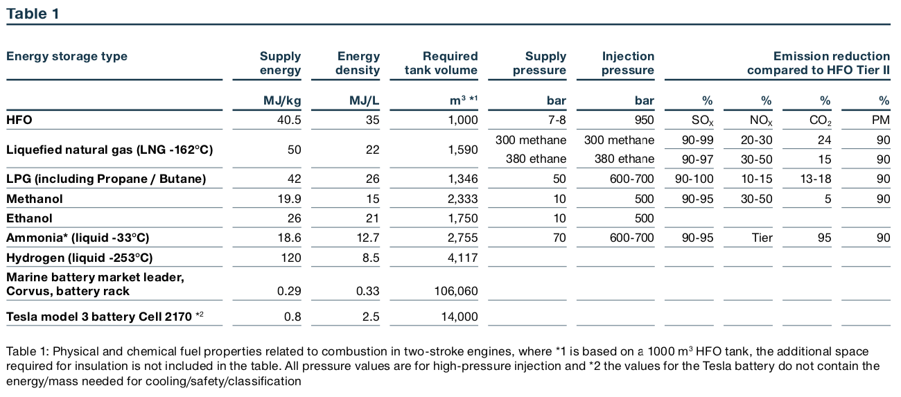 MAN’s technical paper presents key data on maritime fuel properties. The argument for ammonia as an alternative fuel is clear when considering both energy density and CO2 emission reduction. The first impacts profitable cargo capacity, whereas the second impacts compliance, beyond today’s SOx and NOx regulations, with the IMO’s forthcoming GHG regulations.