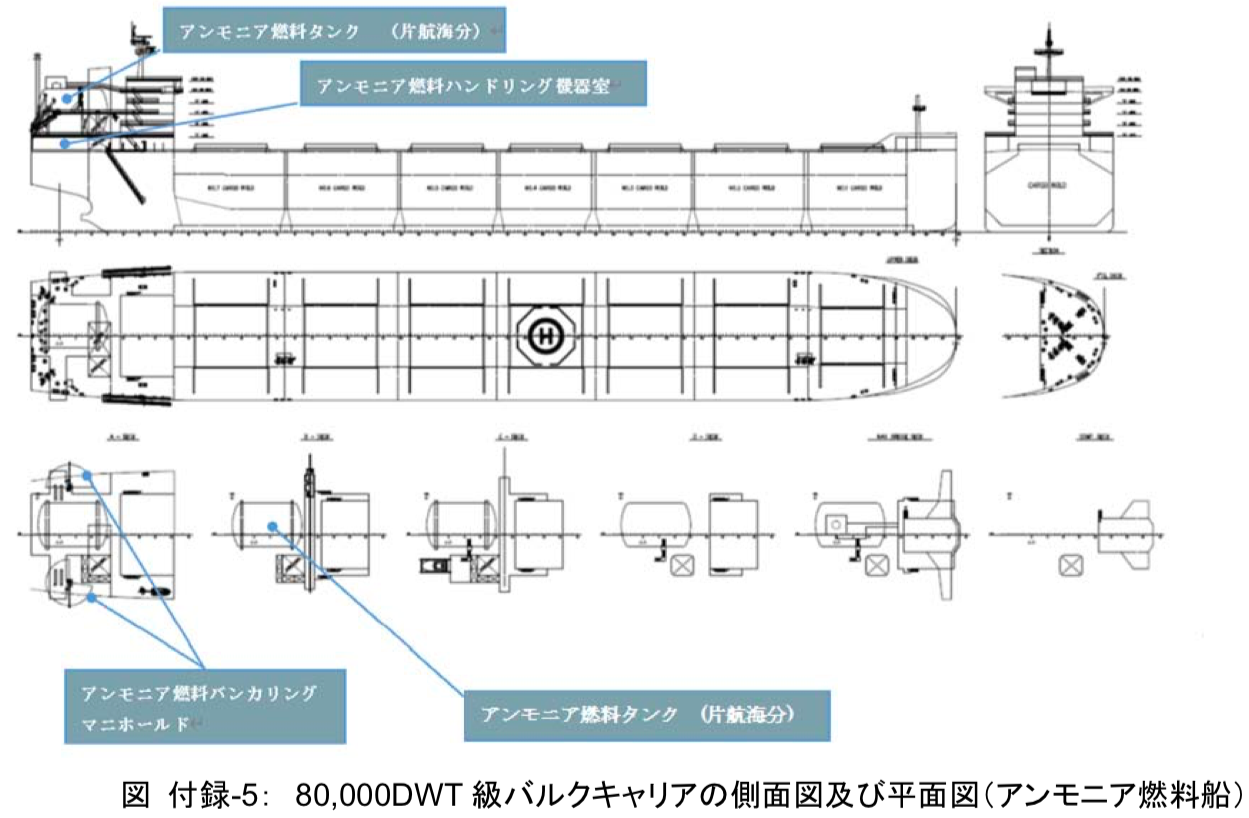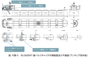 MLIT’s ammonia eco-ship design is based on an 80,000 dwt bulk carrier, which “is assumed to be Japan-Australia route.” It employs dual-fuel engine technology “that has a proven track record with methanol, LPG, etc” (this describes the MAN ES ammonia engine now in development), which requires a pilot fuel, presumably fossil-based. This cannot therefore be a truly zero-emission vessel due to the continued use of a hydrocarbon pilot fuel. Nonetheless, in this “ultra-low carbon” ship, a “CO2 reduction effect of 91.9% is expected compared to the conventional ship of the same type.”