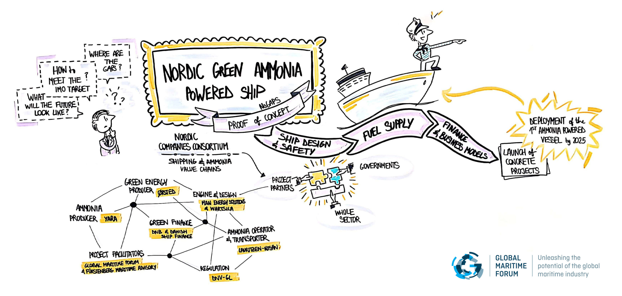 The consortium partners in NoGAPS include the Global Maritime Forum; ship owner/operator Lauritzen Kosan, which specializes in bulk transport of chemicals and gas, including ammonia; ammonia producer Yara; engine manufacturers Wärtsilä and MAN Energy Solutions; classification society DNV GL; renewable energy producer Ørsted; project facilitator Furstenburg Maritime Advisory; and, from the finance side, Danish Shipping Finance and DNB.