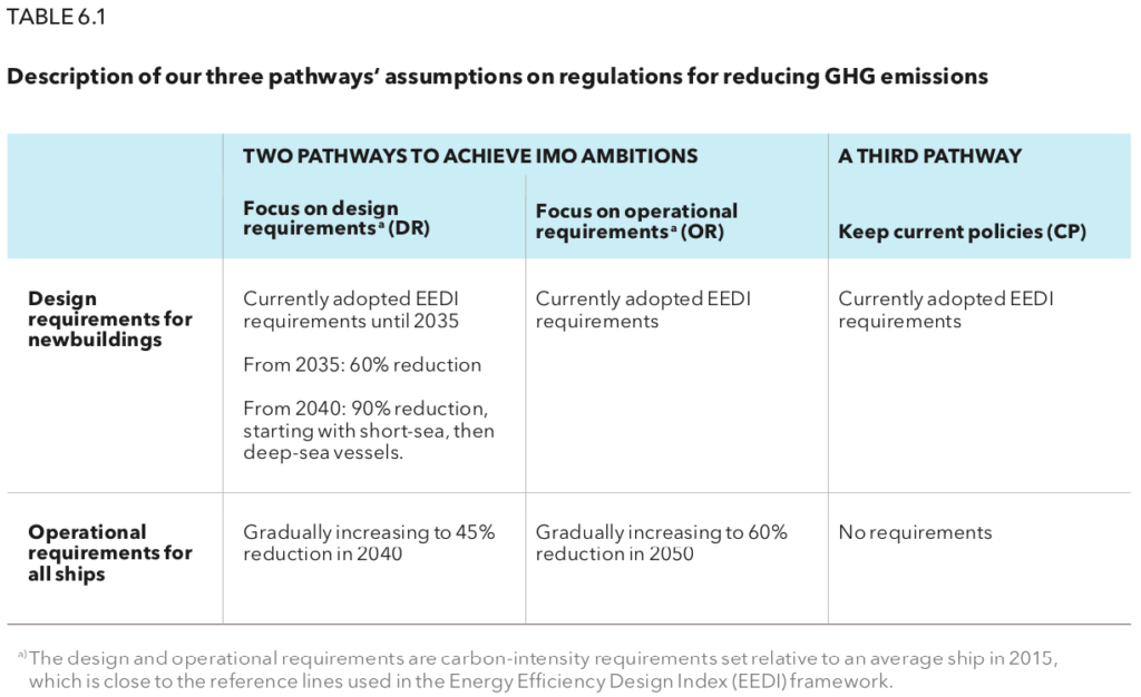 DNV GL models three pathways, two of which achieve the IMO ambitions (defined in the report as “50% GHG-reduction and 70% carbon-intensity reduction in 2050 compared with 2008”). One pathway models the impact of regulations focused on “Design Requirements” (DR), while the other pathway models rules relating to “Operational Requirements” (OR).