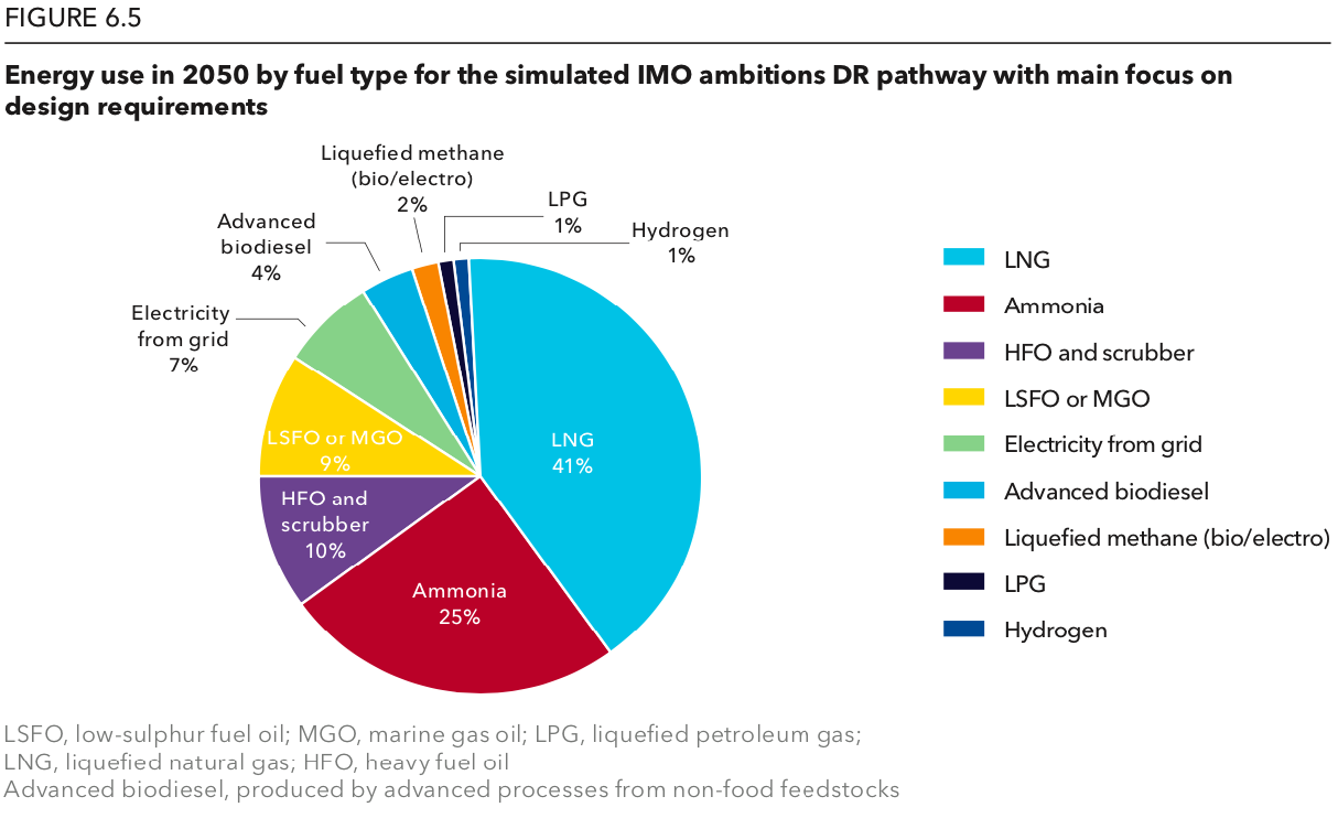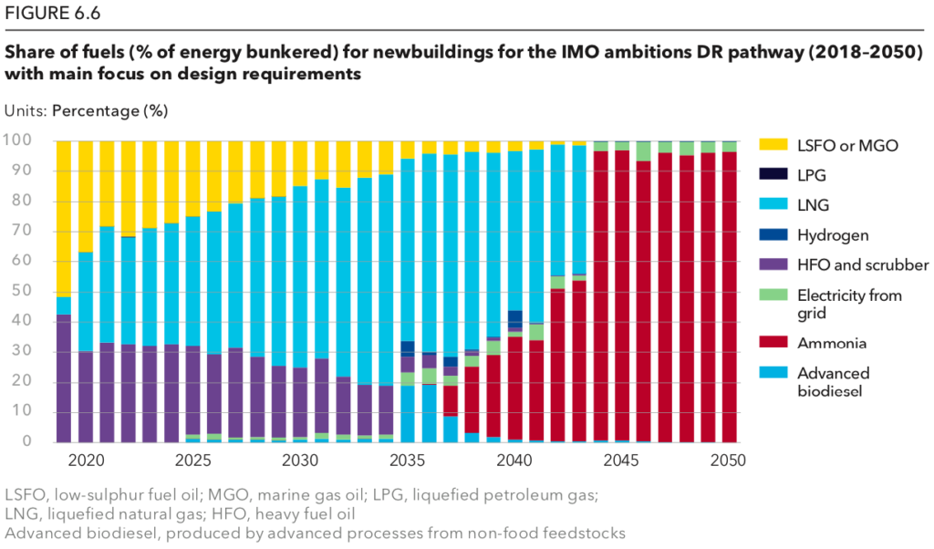 Ammonia captures a 25% share of the maritime fuel mix if regulations focus on ship design (the DR Pathway). If, instead, regulations focus on ship operation (the OR Pathway), ammonia assumes a smaller role, representing the fuel of choice for only around 12% of newbuilds by 2050 and a small fraction of the sector’s global fuel consumption, which is dominated by LNG and its non-fossil counterparts: synthetic renewable methane and biogas (see Section 6.4 and Figure 6.7 in the report). Still, 12% of all newbuilds is a huge number.