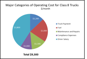 Milton’s range for the status-quo cost per month aligns with industry figures for total cost of truck ownership in the U.S. Major cost elements include acquisition of the vehicle; maintenance and repairs; compliance expenses (insurance, permits, etc.); driver salary; and fuel. (See How to Calculate Cost per Mile for Your Trucking Company at right.) For a truck that travels 4,000 miles (6,440 km) per month; realizes average class-8 fuel economy of 6.4 miles per gallon (2.7 km/l); and buys diesel fuel at the U.S.’s current on-road average price of $3.24 per gallon, the monthly fuel bill is $2,000. If hydrogen could be dispensed at $2.00 per kg and consumed with 50% energy efficiency, fuel savings would amount to approximately $1,000 per month.