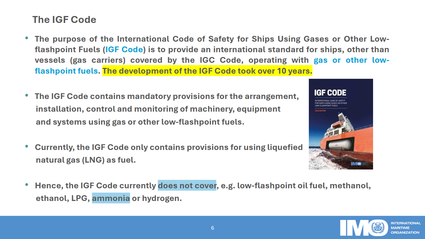 Click to enlarge. The IGF Code and updates required for new alternative fuels. From A Nironen, Interim Guidelines for the safety of ships using ammonia as fuel (Jan 2025).