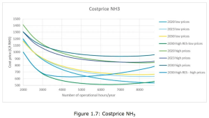 The availability of low cost electricity during a large percentage of the time will be a challenge … For the short term, the costs of CO2 free NH3 are higher compared to the cost of NH3 on the basis of natural gas (300-350 EUR/ton). In 2030 in high renewable energy scenario cases the price differences are smaller. With further optimisation of the operational hours the break-even point might be reached.