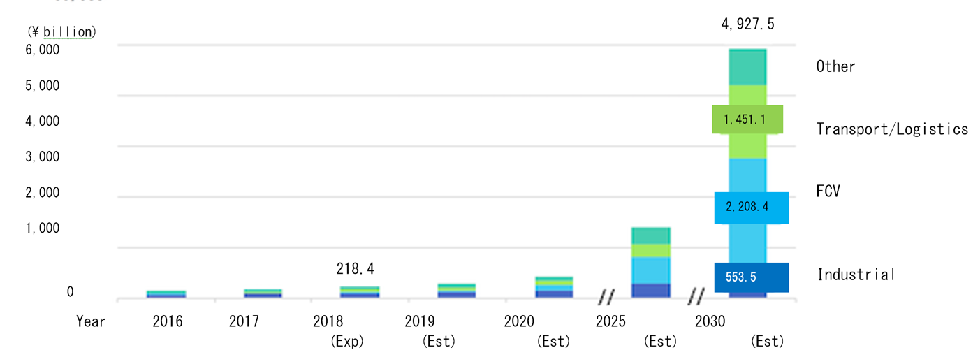 The two earlier Fuji-Keizai reports provide similar breakdowns through the same end-point year (2030), which allows market numbers to be lined up and compared. The general trend is down. With one major exception, the category-by-category numbers for the end point projected in 2016 were lower than the end point numbers from 2014. Ditto for 2018 vs. 2016. End point sales in the fuel cell vehicle category, for example, were projected in 2014 at ¥4,220 billion (USD$38.0 billion); ¥2,631 billion (USD$23.7 billion) in 2016; and ¥2,208 billion (USD$19.9 billion) in 2018. The Transport and Logistics category is the major exception, rising from an end point projection in 2014 of ¥260 billion (USD$2.3 billion) to ¥1,451 billion (USD$13.1 billion) from the perspective of 2018.
