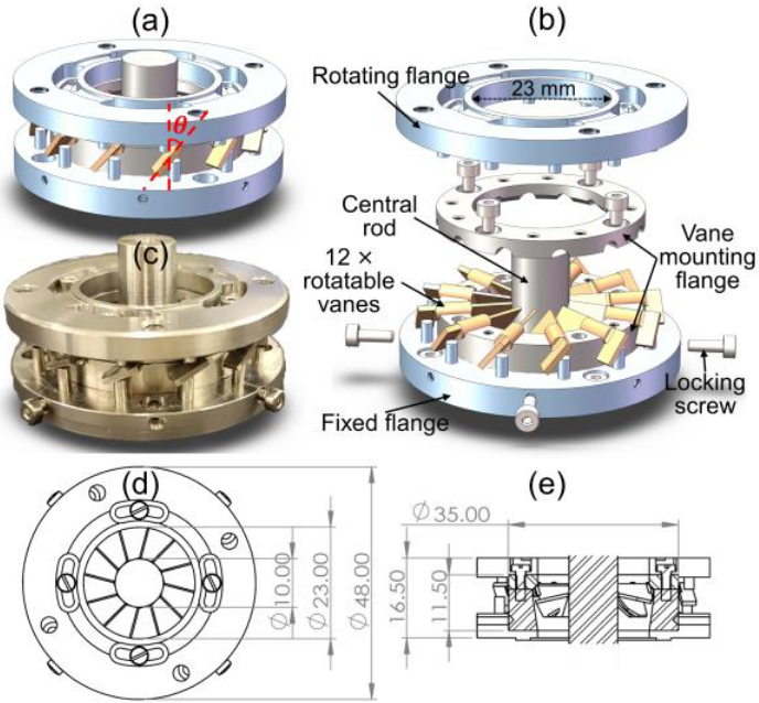 Click to enlarge. The adjustable axial swirler. From Wang et al., “Exploring the Effects of Swirl Intensity on NO Emission in Ammonia-Methane-Air Premixed Swirling Flames”, Journal of Ammonia Energy 1 (2023).
