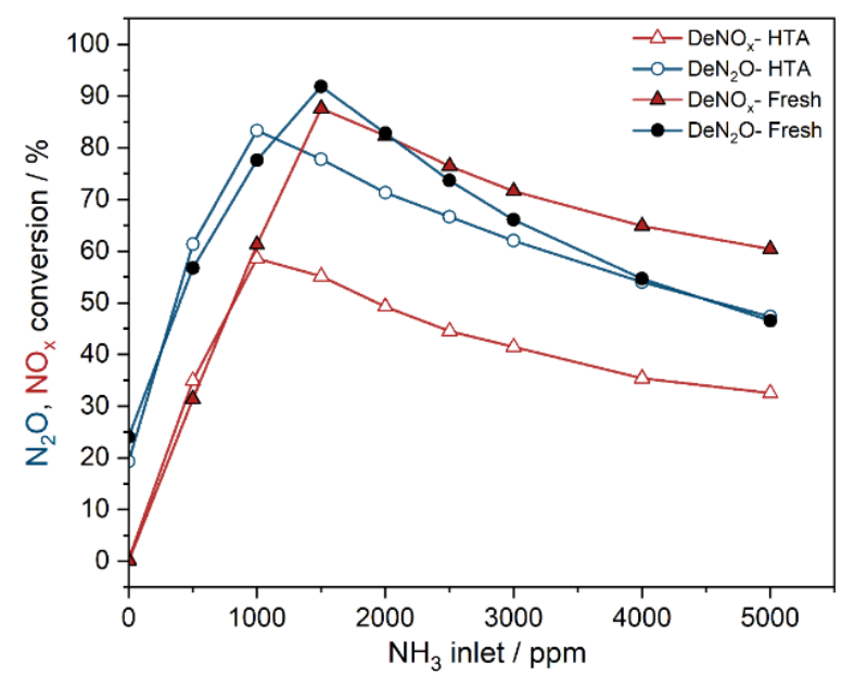 Click to enlarge. Impact of NH3 on the N2O and NOX conversion of pristine and hydrothermally aged industrial catalysts. From Blanco et al., “Critical aspects in the catalytic emission control of exhaust gases containing NH3, NOX and N2O”, Journal of Ammonia Energy 2 (2024).