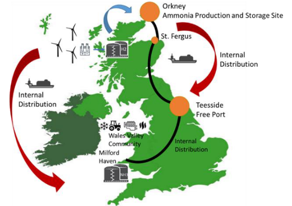 - Scenario A: Hydrogen production from wind energy in Orkney and fed into a Haber Bosch unit ammonia synthesis and storage thereafter. The ammonia is then transported via ship to the Milford Haven Port where it is stored and then cracked thermally into hydrogen.