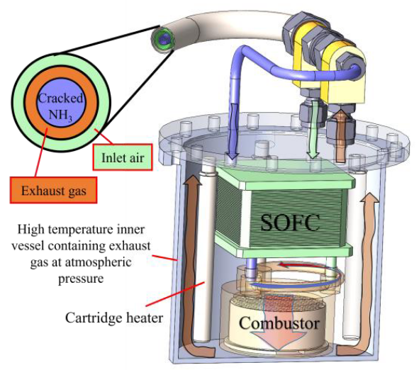 Click to enlarge. Preliminary design of the integrated indirect ammonia fuel cell. From Peters et al., “An indirect ammonia fuelled solid-oxide fuel cell system with free cracking from waste heat”, Journal of Ammonia Energy 2 (2024).