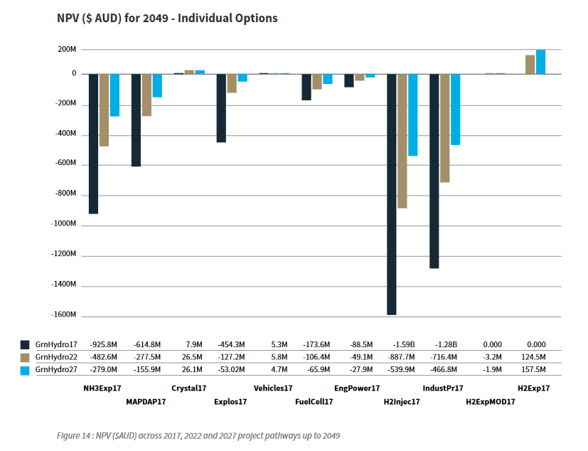 “Pathway A2,” which describes the use of ammonia to facilitate “Large scale hydrogen for export,” has a NPV in excess of AUD$100 million. “All other options … exhibit negative NPV” (or a very small positive NPV in two cases).