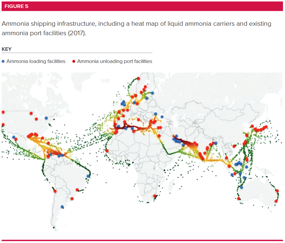 The Royal Society policy briefing illustrates the “high level of maturity” in ammonia storage and distribution infrastructure with a world map that shows both the locations of existing import / export terminals, and a heat-map of current trade routes.