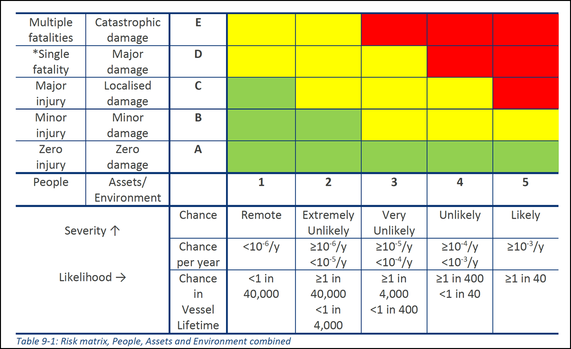 If applied, these mitigation measures can turn the E3 ranking into a D1 ranking: something whose odds of occurrence are “remote” (a probability of less than one event in a million ship-years) but that could cause “major damage” with “one death or multiple individuals with long-term health effects.” De Vries deems failure modes with rankings of D1 and others in the yellow zone of the matrix to be “tolerable,” as distinct from the “unacceptable” nature of failure modes with rankings in the red zone.
