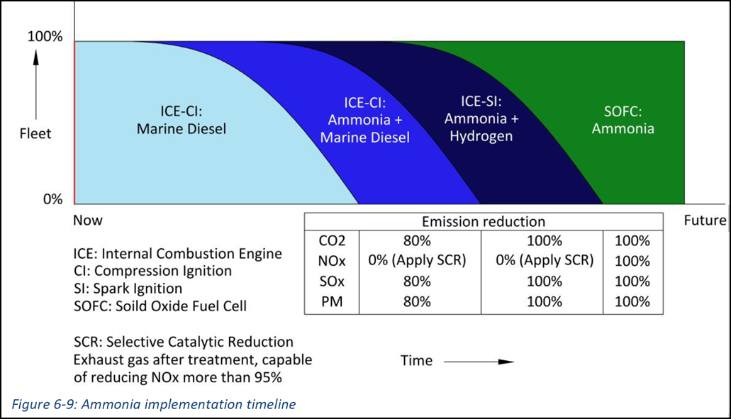 The thesis is notable throughout for its rigor and thoroughness. It devotes five chapters to a techno-economic assessment of potential low-carbon fuels and propulsion systems for the maritime sector. Addressing ammonia’s characteristics as a fuel, de Vries concludes that “Ammonia has a significant higher volumetric energy and has far more practical storage conditions, considering pressure and temperature compared to liquid hydrogen. Furthermore, ammonia requires clearly less energy for renewable synthetic production than the carbon carriers. These are the main reasons to further investigate the potential of ammonia as a marine fuel.”