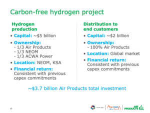 The size of the investment that Air Products is making, both in NEOM and in its sales and distribution network to deliver the NEOM product, is impressive. Beyond the $5 billion plant cost, it expects to invest an additional $2 billion in “distribution to end customers.”