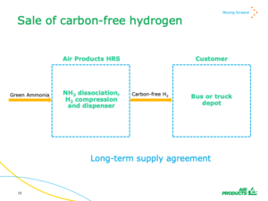 Air Products, the exclusive off-taker, intends to distribute the green ammonia globally and crack it back to “carbon-free hydrogen” at the point of use, supplying hydrogen refueling stations. According to Air Products’ presentation on the project, “our focus is fueling hydrogen fuel cell buses and trucks.”
