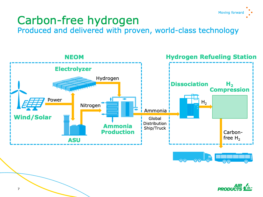 Air Products, the exclusive off-taker, intends to distribute the green ammonia globally and crack it back to “carbon-free hydrogen” at the point of use, supplying hydrogen refueling stations. According to Air Products’ presentation on the project, “our focus is fueling hydrogen fuel cell buses and trucks.”