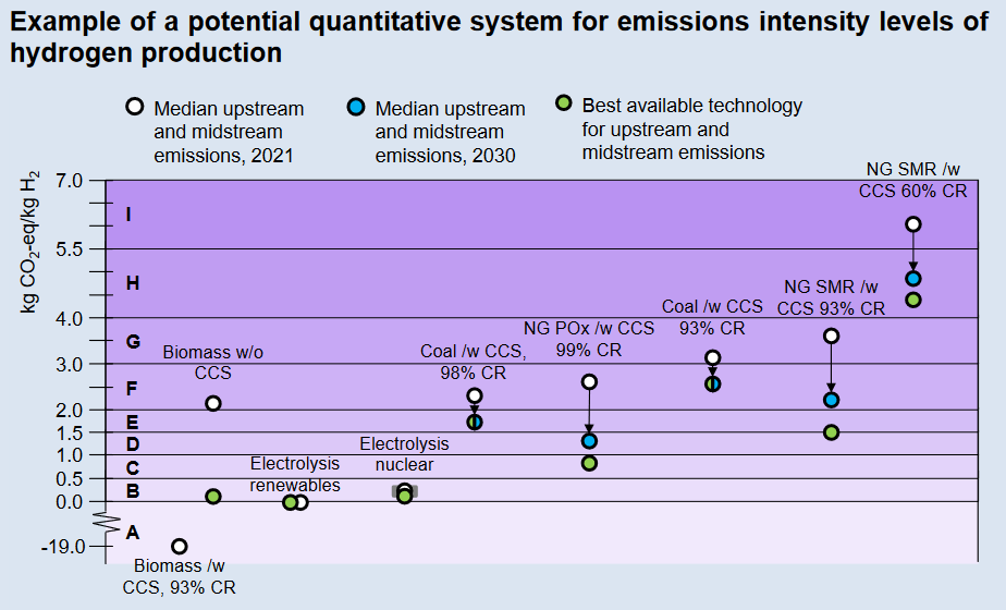The IEA’s proposed solution is “a set of nine distinct, technology-neutral levels”. Beginning with level “A” (emissions intensities below zero), each subsequent level represents an increase in emissions intensity ending with level “I” (7 kg CO2-eq/kg H2). The cap at level “I” was intended to capture all “known hydrogen production routes that can achieve lower emissions than unabated fossil-based routes”.