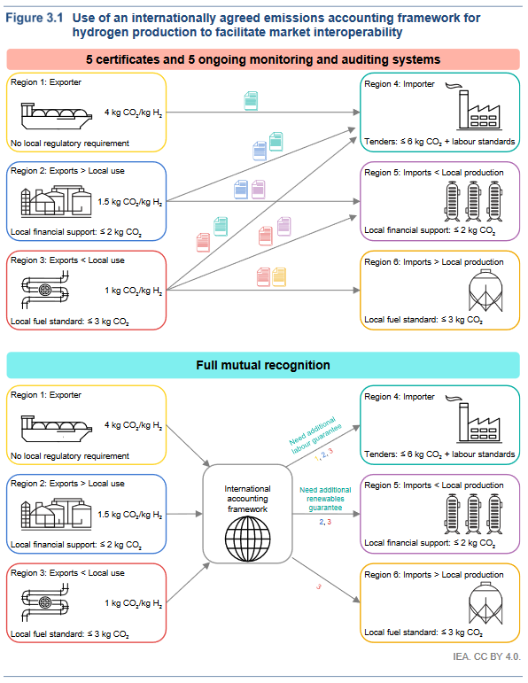 The international framework envisioned by the IEA depends on “mutual recognition of certification schemes” to “minimise market fragmentation”. Mutual recognition refers to the process by which nations agree to accept each other’s certification schemes or standards as equivalent, without the need for additional assessment processes. Mutual recognition could radically reduce barriers to trade in the global hydrogen marketplace, as producers avoid having to obtain new certifications for each jurisdiction they export to.