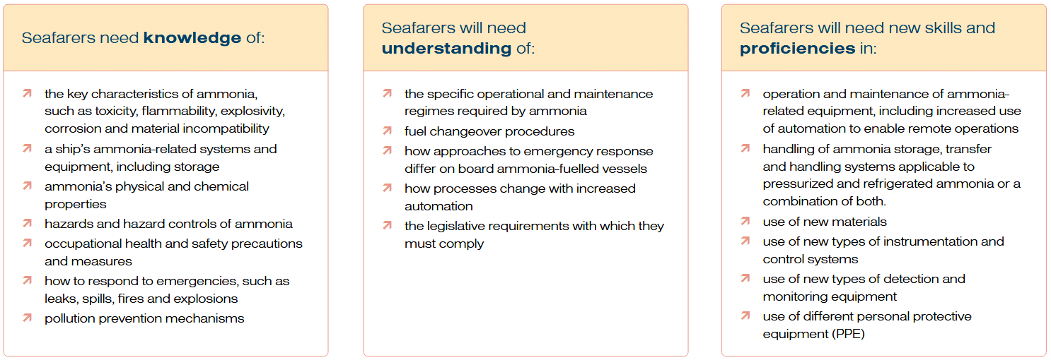 Click to enlarge. Examples of new or modified knowledge, understanding and proficiencies (KUPs) that will be required on board ammonia-fueled vessels. From Ammonia as Fuel Competencies and Training: Project summary report (Feb 2025).