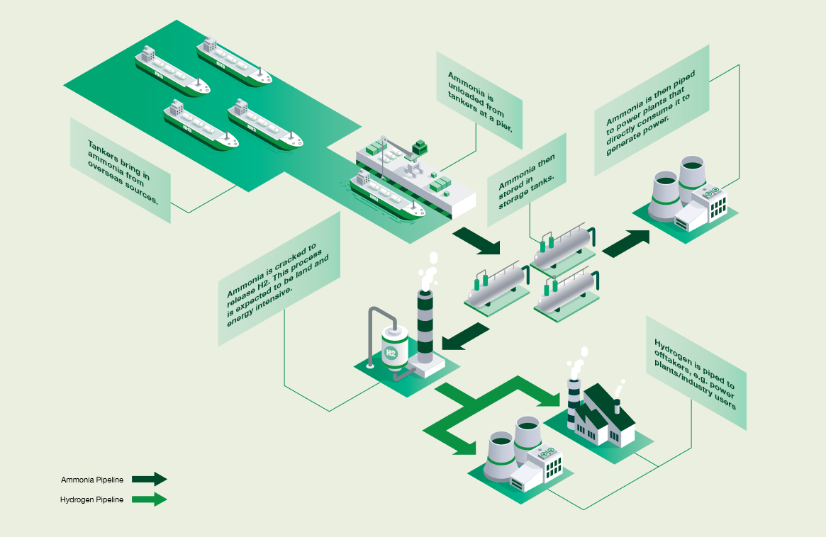 The roadmap suggests a key use for ammonia imports to Singapore will be for power generation: both direct use of ammonia fuel and cracking to produce hydrogen fuel. Ammonia-fueled gas turbines are expected to be commercially available in the middle of this decade, with cracking to enable 100% hydrogen-fueled gas turbines (available by 2030).