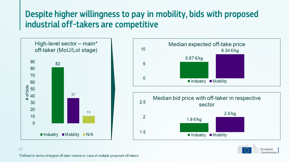 The total bidding pool was also revealing in terms of off-take distribution (see right). Projects with proposed or confirmed industrial off-takers outstripped those with mobility off-takers in the number of bids (82 to 37). Bidders with industrial offtakers also requested a lower median subsidy (i.e., bid price) at 1.8 €/kg, compared to 2 €/kg. This is despite bidders expecting that industrial offtakers will actually pay lower off-take prices than mobility offtakers (5.67 €/kg compared to 8.34 €/kg).