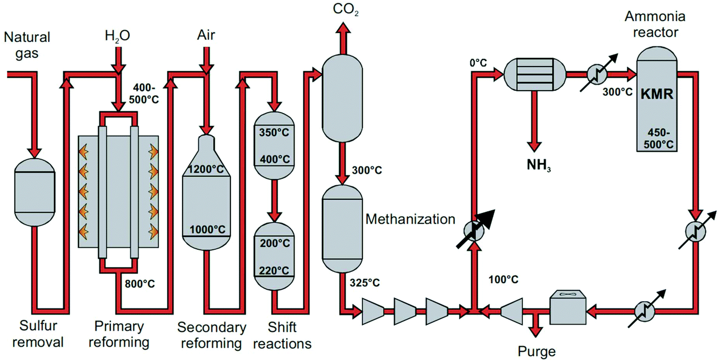 Click to enlarge. Process scheme for ammonia synthesis based on steam methane reforming (SMR). From Hellmann et al., “Ammonia Synthesis: State of the Bellwether Reaction”, Comprehensive Inorganic Chemistry II (Vol. 7, 2013).