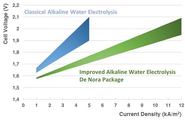 Lastly, the stack design has been successfully optimized over time. Historically, the electrodes were immersed in the electrolyte solution, and were not in direct contact with the diaphragm. Therefore, transport of hydroxide ions through the electrolyte caused significant resistances and thus heat losses. Upon innovating the cell design with the cathode and anode in contact with the diaphragm in a ‘zero gap cell’, these transport resistances are lower, resulting in a better cell efficiency.