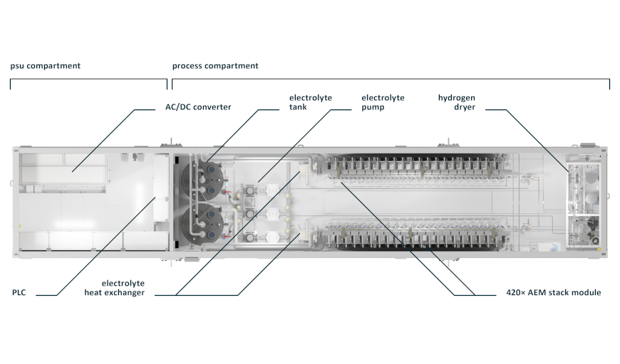 AEM electrolyzers benefit from the compact cell architecture like PEM electrolyzers. The highly acidic environment in PEM electrolyzers means that expensive titanium coatings are required on the bipolar plates. However, in case of AEM electrolyzers, nickel can be used instead. Due to the membrane between the cathode and anode, AEM electrolyzers can operate as flexibly as PEM electrolyzers without significant crossover of H2 and O2 (a potential safety concern with PEM electrolysis).