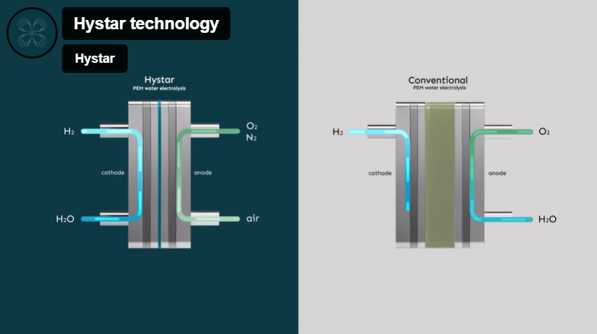 Hystar reduces this risk by introducing humidified air on the anode side, instead of water. This results in strongly diluted oxygen in a nitrogen atmosphere, reducing the risk of an explosive mixture. Therefore, Hystar can utilize a thinner membrane (20 μm). This allows the electrolyzer to operate at 2.5 times the current density compared to a conventional PEM electrolyzer.