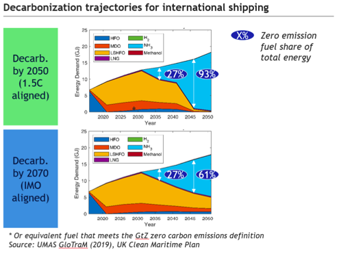 A new roadmap from UMAS and the Getting to Zero Coalition forecasts new, key milestones for the adoption of zero-carbon fuels by the shipping sector so it stays aligned with the Paris Agreement — 5% by 2030, 27% by 2036, and 93% by 2046. UMAS & GTZ see three primary avenues to drive the immediate 2030 milestone: container shipping, ammonia & LNG tankers and “niche” international routes (non-container).