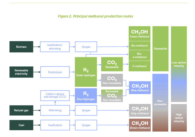 According to Innovation Outlook Renewable Methanol, a report co-authored by the International Renewable Energy Agency (IRENA) and the Methanol Institute and released in January 2021, “Around 98 million tonnes (Mt) [of methanol] are produced per annum, nearly all of which is produced from fossil fuels (either natural gas or coal).” Annual production of ammonia is currently around 180 million tonnes which is derived primarily from the same two feed stocks. Like ammonia, the interest in methanol as a fuel is contingent entirely on the availability of climate-friendly versions that can help users meet greenhouse gas reduction goals.