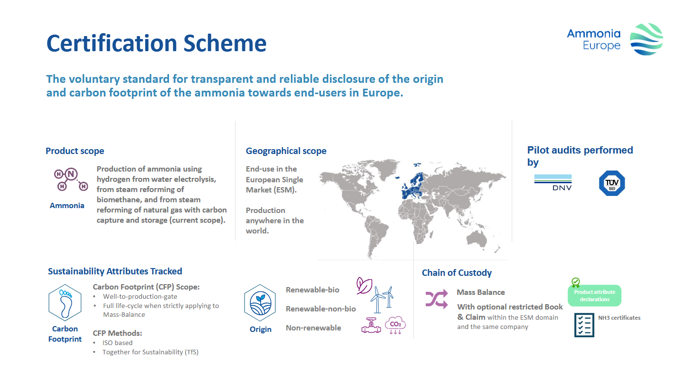 With the official launch of Ammonia Europe this month, the EU-based organisation’s certification scheme is now fully in focus. End-users in the European single market will be able to use the program to calculate GHG emissions footprint and trace the origin of the ammonia product. Producers will be able to use the voluntary scheme to attract EU customers. The scheme will run via a mass-balance chain of custody, with optional restricted Book & Claim available.
