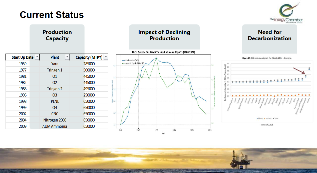 Click to enlarge. Installed ammonia production capacity, declining ammonia production, and the need for decarbonization in Trinidad & Tobago. From Dale Ramlakhan, Ammonia Sector in Trinidad and Tobago: A Path to Sustainability (Jan 2025).