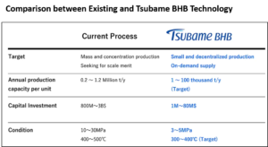 In October 2019 Tsubame commissioned a pilot plant with a nominal capacity of 55 kg per day (20 tonnes per year) at food producer Ajinomoto’s factory in the city of Kawasaki. According to an October 5, 2020 Tsubame press release, the fact that the plant has been able to “achieve continuous operation” represents “a major step toward commercialization.”