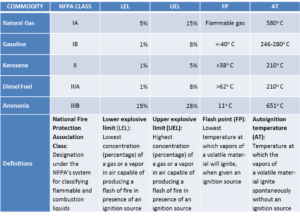 Relative to flammability and explosibility, ammonia resides in category IIIB in the categorization scheme used by the National Fire Protection Association and Federal agencies in the U.S. IIIB is the least hazardous category. Another substance found in category IIIB is vegetable oil. Natural gas, gasoline, and diesel fuel are found respectively in categories IA, IB, and IIIA.