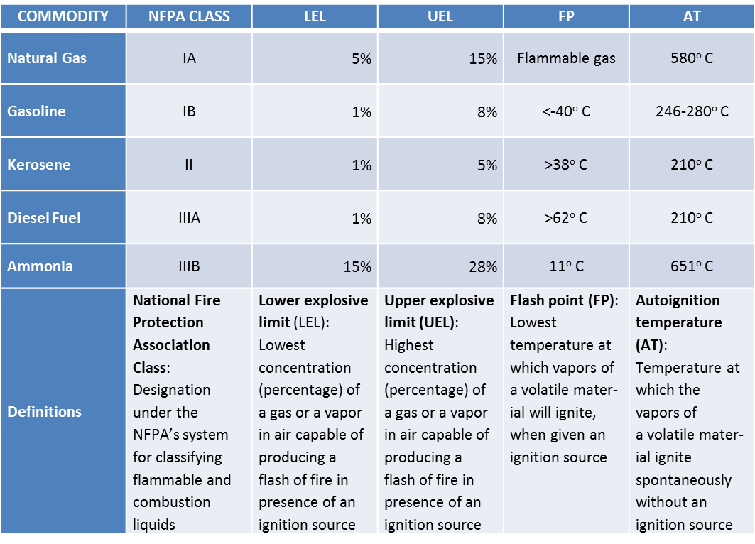 Relative to flammability and explosibility, ammonia resides in category IIIB in the categorization scheme used by the National Fire Protection Association and Federal agencies in the U.S. IIIB is the least hazardous category. Another substance found in category IIIB is vegetable oil. Natural gas, gasoline, and diesel fuel are found respectively in categories IA, IB, and IIIA.