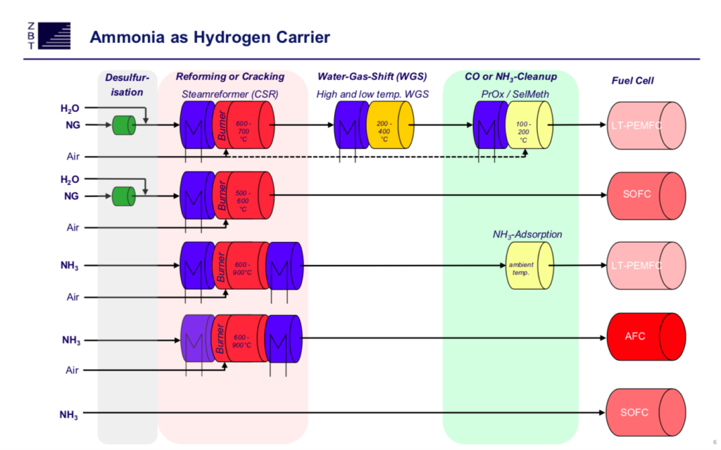 To bring this into focus, consider the range of fuel cells designed to run on ammonia. Appropriately configured solid oxide fuel cells (SOFCs) can accept ammonia directly as a fuel. Simple. But the high temperatures at which SOFCs operate introduce a constraint: they are best suited for applications that involve continuous or near-continuous operation. Low-temperature fuel cells, by contrast, can be applied to use cases involving short and frequent on-off cycles, as well as those involving continuous operation. But most of the designs leading the low-temperature pack involve front-end modules that convert ammonia into hydrogen. In some variants, the requirement is to achieve extreme hydrogen purity. In others, the demands on the front end are moderated by stack designs that can tolerate uncracked ammonia. Either way, a system with a front end is not as simple as a system that accepts ammonia directly. (Ammonia Energy summarized many of the pertinent development efforts in a 2018 Annual Review article.)