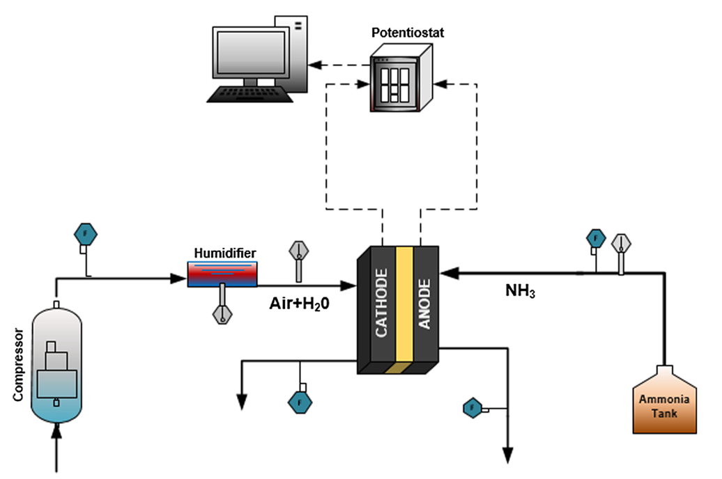 The design demonstrated by Siddiqui and Dincer does without a front end, and in fact does without almost everything else except the fuel cell stack itself. The stack includes the normal components that make up the anode-membrane-cathode sandwich. Gaseous ammonia, introduced on the anode side, flows through a gas diffusion layer coated with a platinum-containing catalyst, in the process undergoing the series of reactions that produce diatomic nitrogen, water, and free electrons. Humidified air, subject to a small degree of compression and introduced on the cathode side, flows through another gas diffusion layer which is also coated with a platinum-containing catalyst. The product here, with the addition of the electrons that were produced on the anode side, is hydroxide (OH-) ions. An anion exchange membrane selectively allows the passage of the hydroxide ions to the anode side, where they are central players in the ammonia-to-water reaction sequence. The set-up and electrochemistry are simplicity itself.