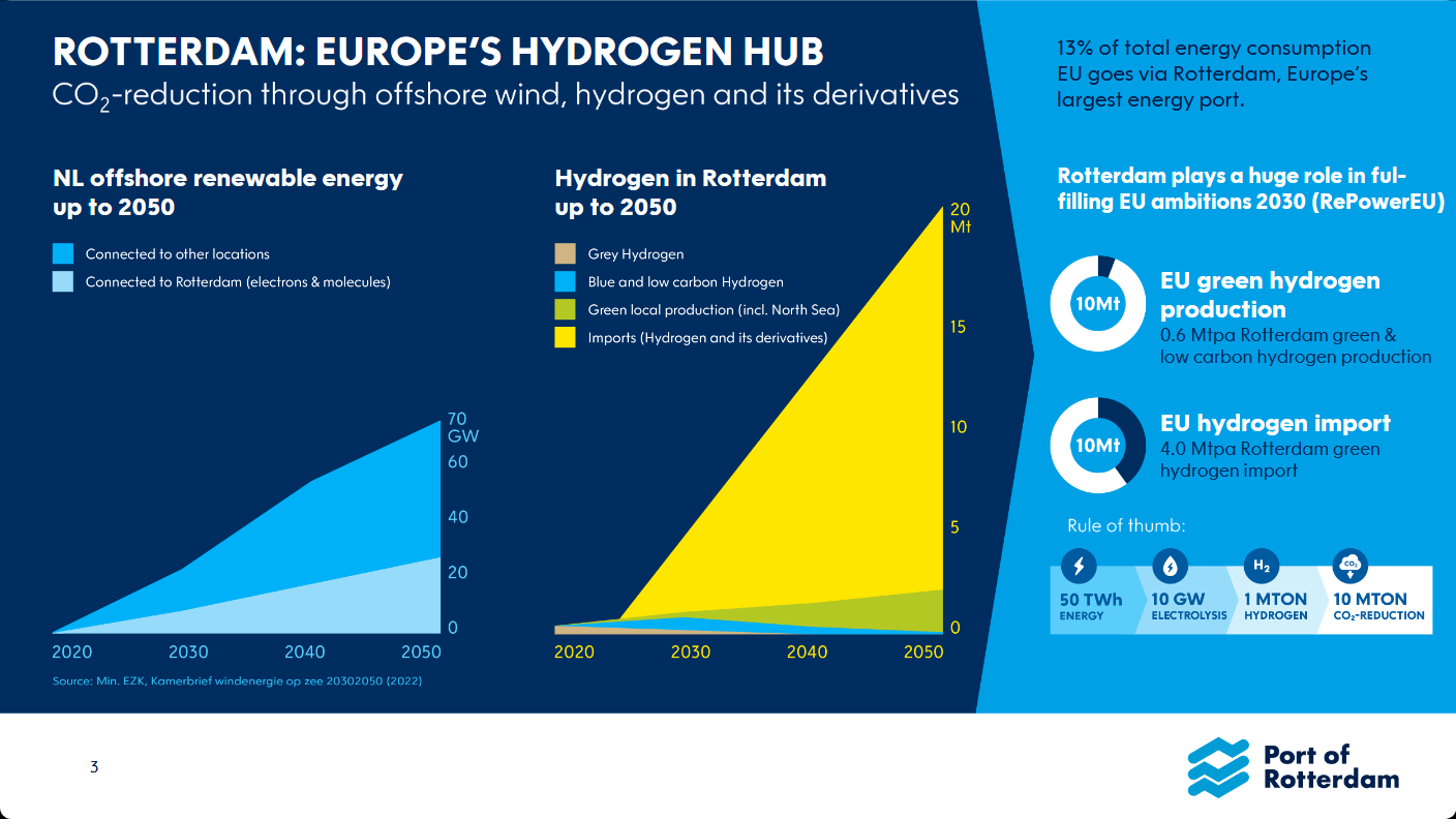 Click to expand. Production and import of hydrogen and hydrogen derivatives at the Port of Rotterdam – ambitions to 2050. From Mark Stoelinga, Rotterdam: Europe’s Hydrogen Hub (July 2024).