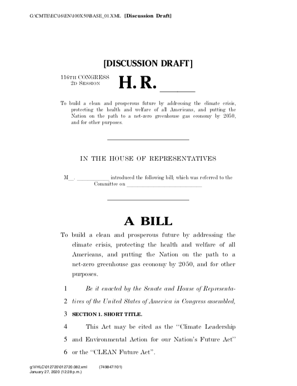 US House of Representatives, CLEAN Future Act discussion draft, January 27, 2020