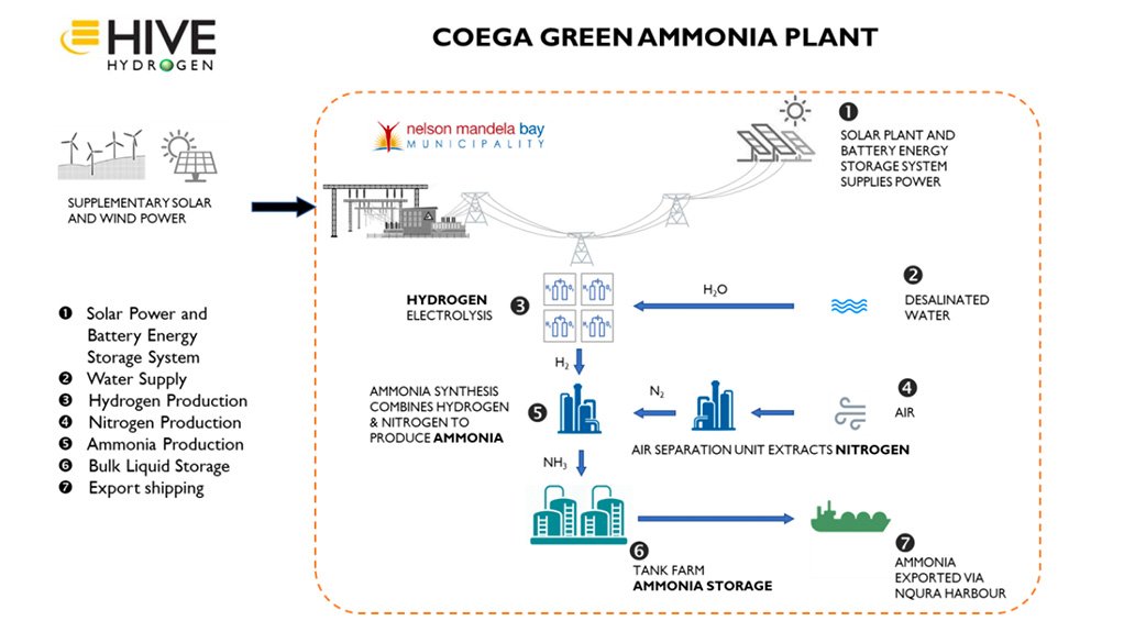 Hive Hydrogen and Linde will lead the development & construction of a $4.6 billion, 780,000 tonnes per year solar ammonia export facility located next to the Port of Ngqura in Nelson Mandela Bay, South Africa. A dedicated solar farm (with battery storage) will be built nearby and power hydrogen production via electrolysis, air separation and ammonia production via Haber Bosch. Desalinated seawater will be supplied from off-site. Once produced, the ammonia will be stored for export from the adjacent Ngqura Harbour. No date for the final investment decision was set in the announcement, and Mining Weekly reports that the first phase of the project will go live in 2025, with full capacity to be reached in 2026.