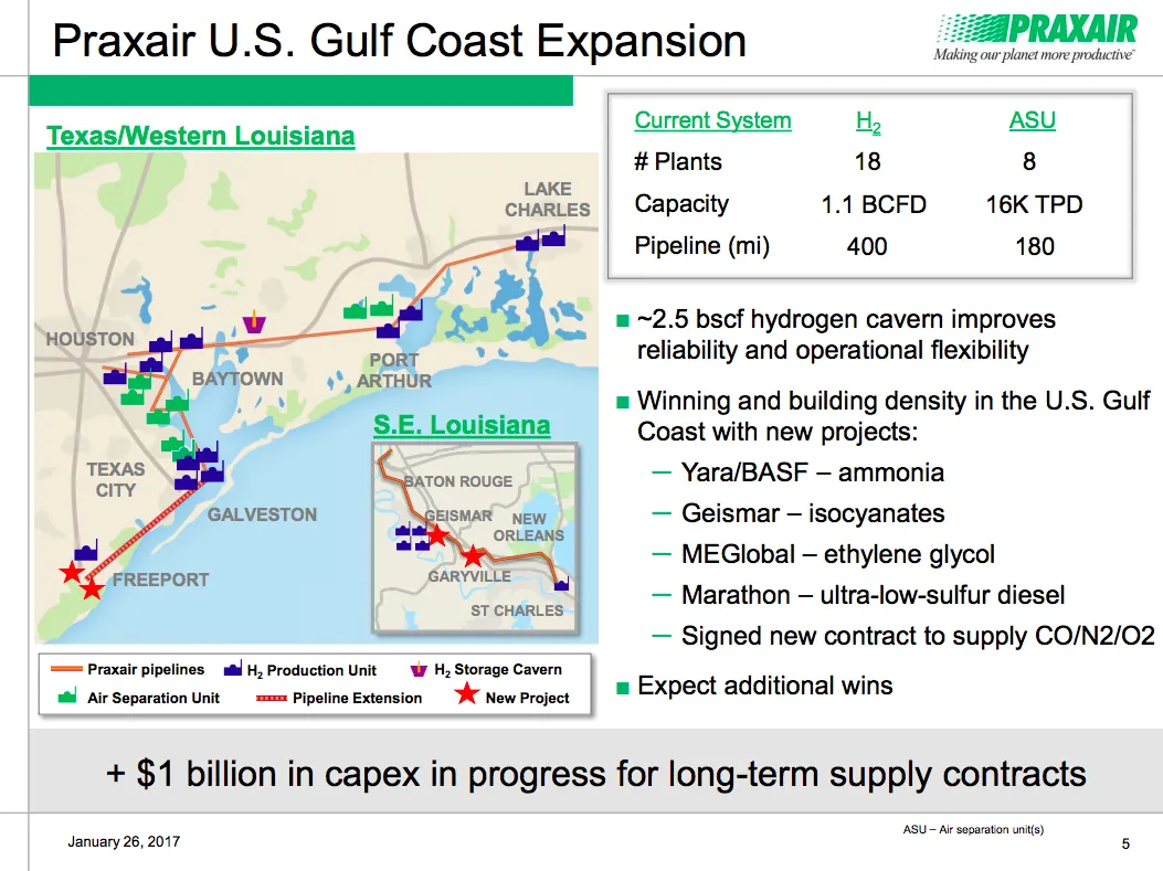 Praxair is supplying hydrogen and nitrogen to the Freeport plant through its hydrogen grid. Its recent Gulf Coast expansion included a $400 million investment in new hydrogen generating capacity and an extension of its hydrogen pipeline system that would stretch “46 miles from Texas City to the Freeport area.”
