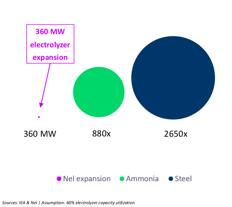 If Nel can achieve these ambitious cost and efficiency targets for its electrolyzers, it sees ammonia as a good first opportunity, but identifies “Massive future potential from CO-free steel production.”